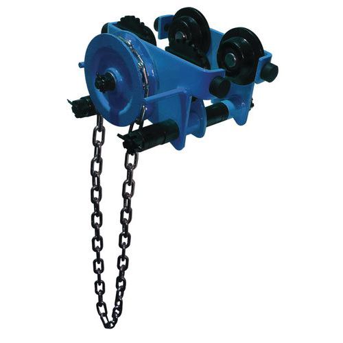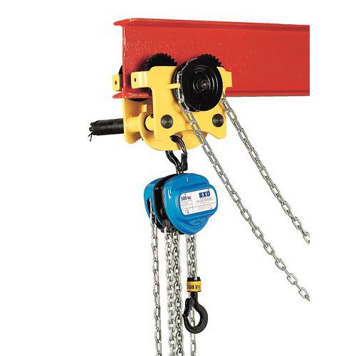 Palan manuel construit entièrement en acier offrant un maximum de robustesse et de sécurité pour un encombrement très réduit. Triple engrenage sous carters très résistants aux chocs. Mécanisme monté sur roulements à aiguilles avec guide-chaîne enveloppant pour un fonctionnement sans faille. Frein automatique sans amiante assurant l'arrêt instantané de la charge dès que la traction cesse sur la chaîne de manœuvre. Graissage des portées assuré pour plusieurs années de fonctionnement pour une longévité supérieure. Chaîne de levage très résistante traitée contre la corrosion. Palan (coefficient de sécurité 5) équipé d'une fin de course mécanique en mouvement descente et d’un frein à double cliquet pour une sécurité optimale. Convient à toutes les poutrelles IPN, IPE, HEA et HEB.