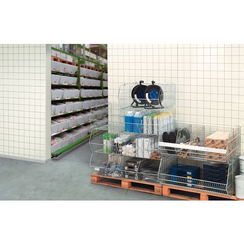 Remplissage et prélèvement aisés même quand les paniers sont empilés. Très robuste, il supporte jusqu’à 3 fois sa charge maxi unitaire.