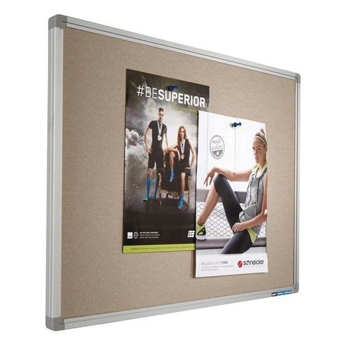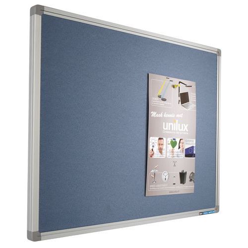 Tableau d'affichage textile punaisable. Surface haute qualité 100 % recyclée. Large éventail de coloris pour le fond. Matériau aluminium anodisé de qualité. Pourtour avec profils et coins plastique. Entretien aisé. Résiste au feu.
