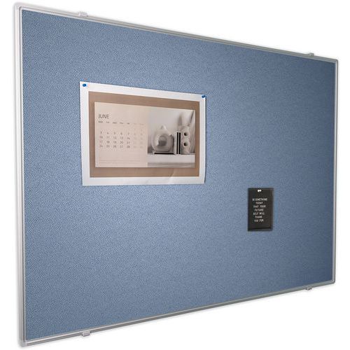 Tableau d'affichage textile punaisable. Surface haute qualité 100 % recyclée. Large éventail de coloris pour le fond. Matériau aluminium anodisé de qualité. Pourtour avec profils et coins plastique. Entretien aisé. Résiste au feu.