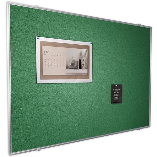 Tableau d'affichage textile punaisable. Surface haute qualité 100 % recyclée. Large éventail de coloris pour le fond. Matériau aluminium anodisé de qualité. Pourtour avec profils et coins plastique. Entretien aisé. Résiste au feu.