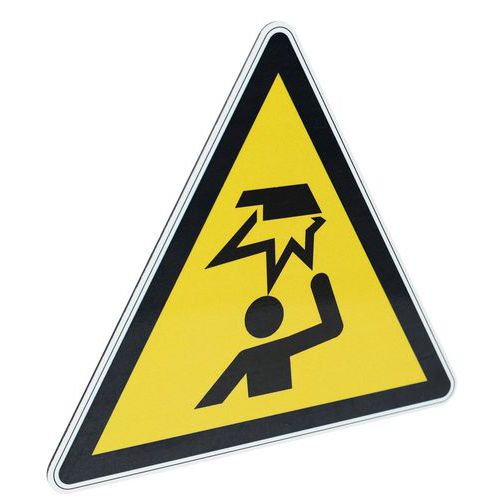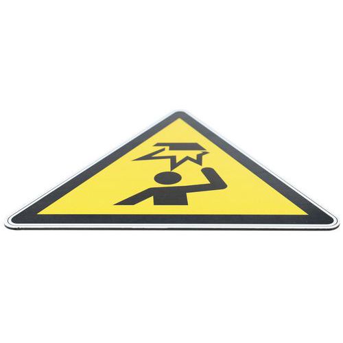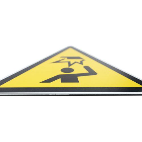 Panneau de signalisation avec pictogramme compréhensible par tous, qui avertit sur le danger causé par des obstacles en hauteur, des angles saillants représentent des risques pour la tête.