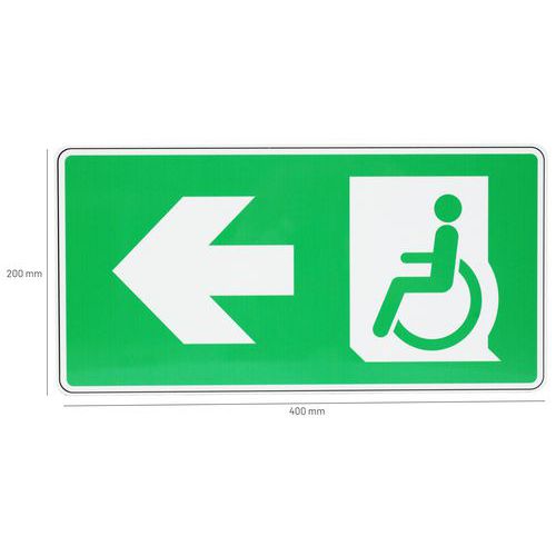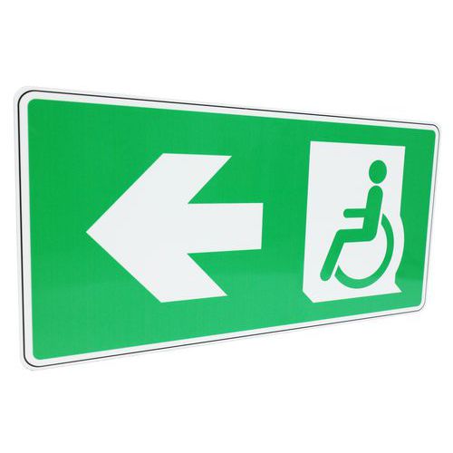 | Intitulé du produit | Panneau Sortie handicapés flèche gauche aluminium, Adhésif: non, Rigide: oui, Norme ISO 7010: oui |