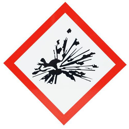 - Panneau avec pictogramme Matières explosives permettant d'indiquer la présence de produits qui peuvent exploser au contact d'une flamme, d'électricité statique ou sous l'effet d'un choc.