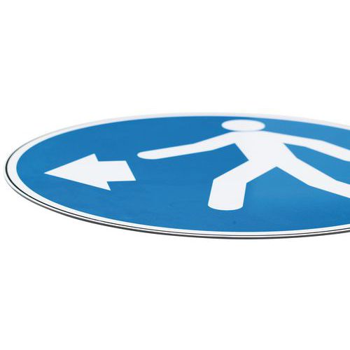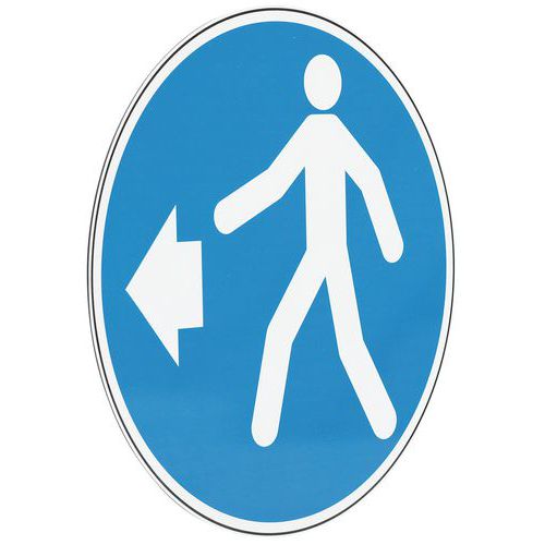 Grâce à ce panneau de signalisation avec pictogramme piéton à gauche, indiquez à tous l'obligation d'utiliser le passage piétons à gauche et évitez les collisions entre individus et véhicules.