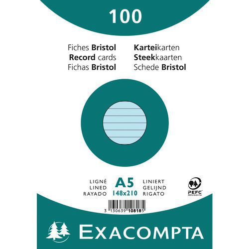 | Intitulé du produit | Paquet 100 fiches bristol ligné non perforé 148x210mm, Grammage: 205 g/m², Nb de feuilles/ramette: 100 |
