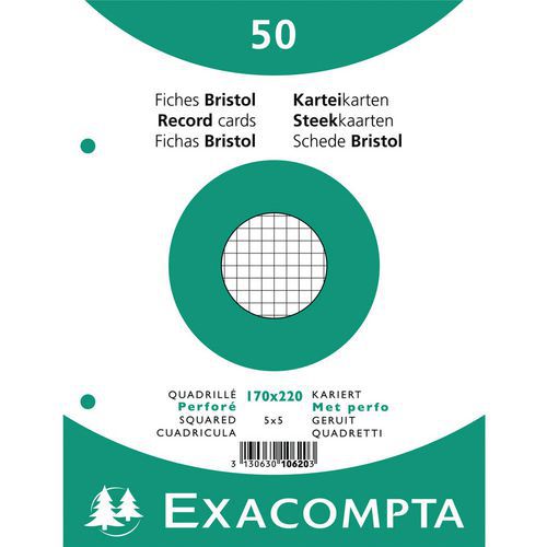 | Intitulé du produit | Paquet 50 fiches sous film quadrillé perforé 170x220mm, Grammage: 205 g/m², Nb de feuilles/ramette: 50 |