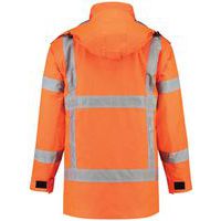 Parka haute visibilité réalisé conformément aux directives du Rijkswaterstaat (RWS) néerlandais. Étanche au vent et à l’eau, respirant et conforme à la norme EN343, classe 3:3, doté de coutures enduites, d’un enduit PU et de zips laminés déperlants. Haute visibilité conformément à la norme EN ISO 20471:2013, classe 3. Ce parka est doté d’une capuche amovible par zip qui se range également dans le col, d’une poche verticale avec zip déperlant, d’une poche intérieure et d’une poche pour téléphone portable. Il est également doté d’un dos rallongé, d’un zip séparable à double curseur et d’un double rabat-tempête anti-pluie. Ce parka possède une doublure thermique amovible, ce qui le rend utilisable à n’importe quelle saison.