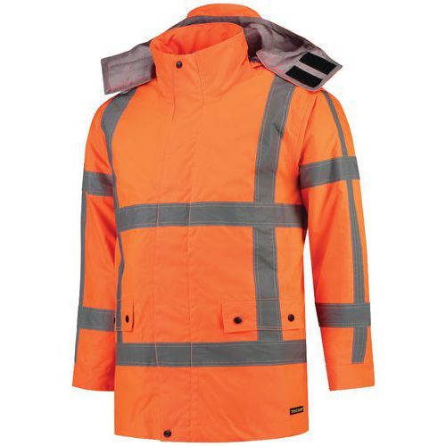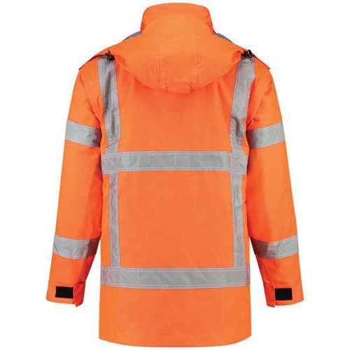 Parka haute visibilité réalisé conformément aux directives du Rijkswaterstaat (RWS) néerlandais. Étanche au vent et à l’eau, respirant et conforme à la norme EN343, classe 3:3, doté de coutures enduites, d’un enduit PU et de zips laminés déperlants. Haute visibilité conformément à la norme EN ISO 20471:2013, classe 3. Ce parka est doté d’une capuche amovible par zip qui se range également dans le col, d’une poche verticale avec zip déperlant, d’une poche intérieure et d’une poche pour téléphone portable. Il est également doté d’un dos rallongé, d’un zip séparable à double curseur et d’un double rabat-tempête anti-pluie. Ce parka possède une doublure thermique amovible, ce qui le rend utilisable à n’importe quelle saison.