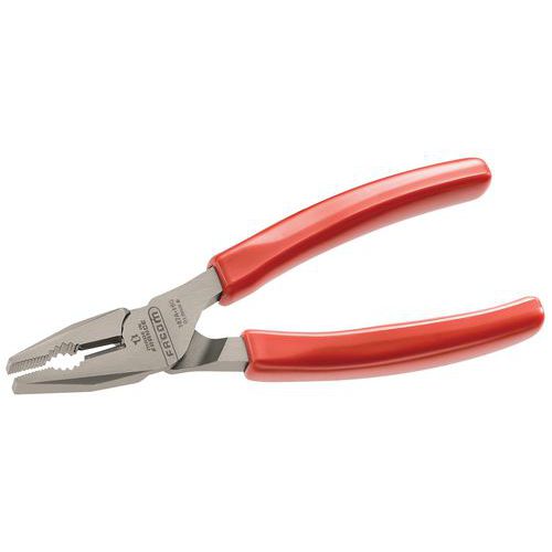 - Pince universelle finition polie et vernie, avec poignées revêtues de gaine PVC pour meilleures préhension et maniabilité.