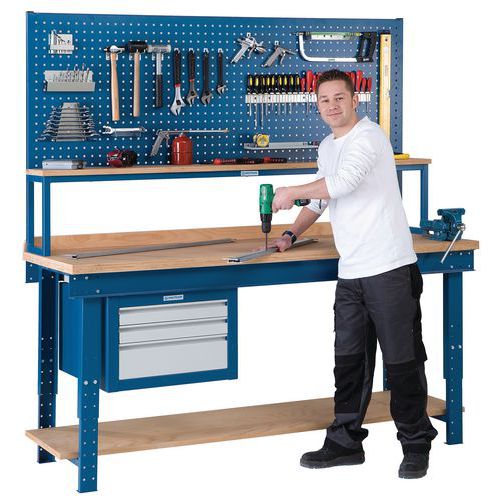 Plaque perforée et support tablette pour établi, Largeur: 1500 mm, Hauteur: 700 mm, Coloris: Bleu, RAL: 5009 Plaque perforée et support tablette pour établi, Largeur: 1500 mm, Hauteur: 700 mm, Coloris: Bleu, RAL: 5009