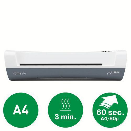 - Plastifieuse iLam Home A4 Set 4-in-1 Leitz, préchauffage rapide en 3 minutes et vitesse de 300 mm/min.