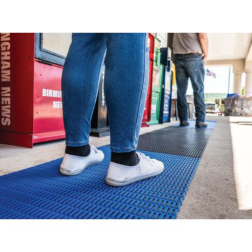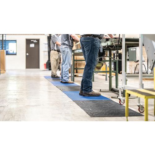Caillebotis PVC souple noir avec bande bleue alternée de positionnement pour le respect de la distanciation sociale. Excellente absorption acoustique, très confortable en position debout avec recouvrement des aspérités au sol. Construction en grille ajourée, de conception légère en grille simple pour excellent drainage des liquides. Fabrication en matériau PVC non poreux offrant une résistance naturelle à la croissance des bactéries. Nettoyage en toute simplicité : à soulever ou rouler pour nettoyage au tuyau sous haute pression. Caillebotis facile à installer avec pose libre, sans fixation requise pour un déplacement aisé.