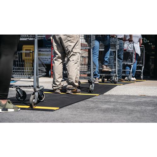 Caillebotis PVC souple noir avec bande jaune alternée de positionnement pour le respect de la distanciation sociale. Excellente absorption acoustique, très confortable en position debout avec recouvrement des aspérités au sol. Fabrication en matériau PVC non poreux offrant une résistance naturelle à la croissance des bactéries. Construction à 2 couches croisées, avec grille PVC ouverte pour un excellent drainage des liquides. Nettoyage en toute simplicité : à soulever ou rouler pour nettoyage au tuyau haute pression. Faîtes respecter confortablement les distances de sécurité à vos visiteurs, clients, employés