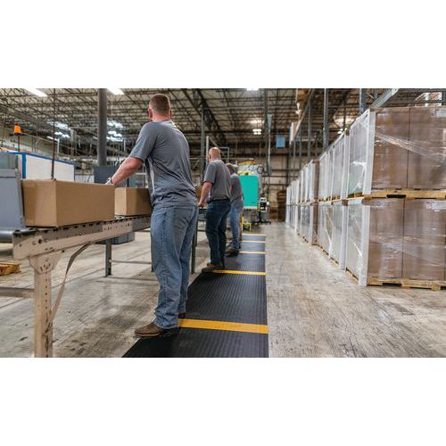 Caillebotis PVC souple noir avec bande jaune alternée de positionnement pour le respect de la distanciation sociale. Excellente absorption acoustique, très confortable en position debout avec recouvrement des aspérités au sol. Fabrication en matériau PVC non poreux offrant une résistance naturelle à la croissance des bactéries. Construction à 2 couches croisées, avec grille PVC ouverte pour un excellent drainage des liquides. Nettoyage en toute simplicité : à soulever ou rouler pour nettoyage au tuyau haute pression. Faîtes respecter confortablement les distances de sécurité à vos visiteurs, clients, employés