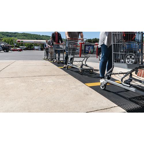 Caillebotis PVC souple noir avec bande jaune alternée de positionnement pour le respect de la distanciation sociale. Excellente absorption acoustique, très confortable en position debout avec recouvrement des aspérités au sol. Fabrication en matériau PVC non poreux offrant une résistance naturelle à la croissance des bactéries. Construction à 2 couches croisées, avec grille PVC ouverte pour un excellent drainage des liquides. Nettoyage en toute simplicité : à soulever ou rouler pour nettoyage au tuyau haute pression. Faîtes respecter confortablement les distances de sécurité à vos visiteurs, clients, employés