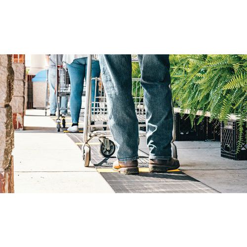 Caillebotis PVC souple noir avec bande jaune alternée de positionnement pour le respect de la distanciation sociale. Excellente absorption acoustique, très confortable en position debout avec recouvrement des aspérités au sol. Fabrication en matériau PVC non poreux offrant une résistance naturelle à la croissance des bactéries. Construction à 2 couches croisées, avec grille PVC ouverte pour un excellent drainage des liquides. Nettoyage en toute simplicité : à soulever ou rouler pour nettoyage au tuyau haute pression. Faîtes respecter confortablement les distances de sécurité à vos visiteurs, clients, employés