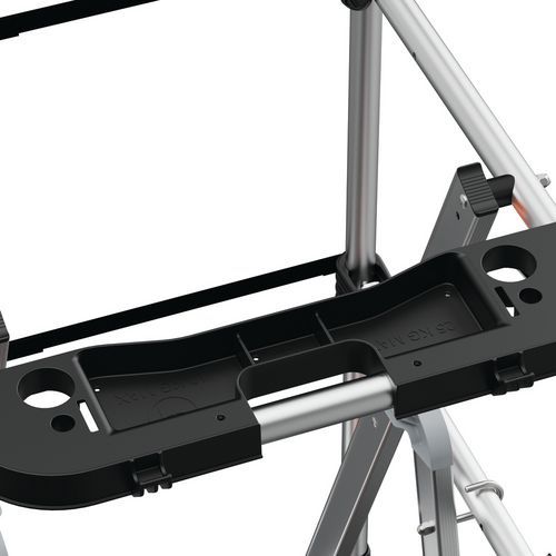Plate-forme de travail Raptor sangle, gamme la plus légère du marché. Garde-corps rigide 3 côtés avec sangles de protection antichute arrière. Marches antidérapantes 80 mm. Porte-outils compartimenté amovible, résistance 25 kg, avec crochets intégrés (maxi 10kg). Plancher 500 x 400 mm antidérapant en bois éco-sourcé. Espace de travail ergonomique. Stabilisateurs rétractables à réglage millimétrique.