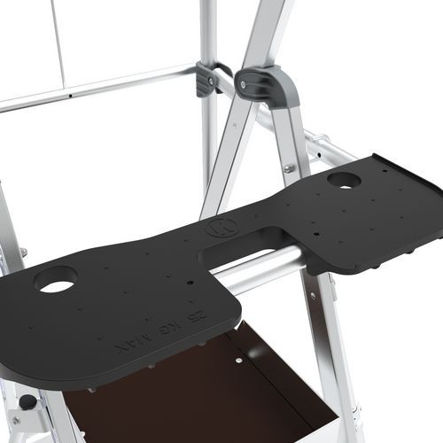 Plate-forme de travail Sherpamatic. Garde-corps rigide 4 côtés avec lisses de protection antichute arrière à fermeture semi-automatique. Marches antidérapantes 80 mm. Porte-outils compartimenté amovible, résistance 25 kg, avec crochets intégrés (maxi 10kg). Tablette XL résistance 25 kg Stabilisateurs rétractables à réglage millimétrique. Plancher grand confort 590 x 400 mm antidérapante en aluminium. Espace de travail ergonomique et confortable. Roues de déplacement tout-terrain Ø175 mm.