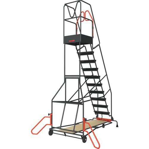 Escabeau de rayonnage roulant à immobilisation automatique pour plus de sécurité et une ergonomie optimale. En acier mécano soudé avec marches autoporteuses antidérapantes et plateau supérieur tôle armée antidérapante. Haute sécurité de l'utilisateur avec portillon d'encadrement du plateau supérieur ouvrable dans un seul sens. Large plateau au niveau inférieur en bois medium vernis résistant, utilisable comme espace de stockage. Stabilité parfaite : stabilisateurs orientables et mains courantes mécanosoudées sur chacun des côtés.