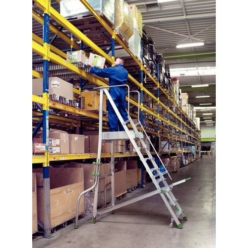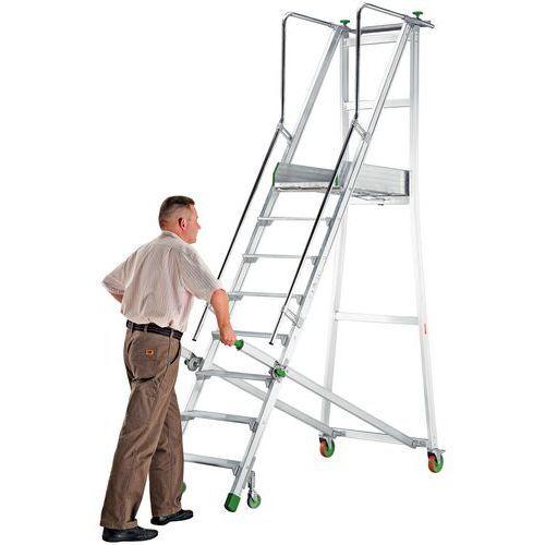 Plate-forme mobile ergonomique simple à déplacer avec poignées pliables. Angle de montée de 60° pour une utilisation facile et sécurisée. Confort et sécurité avec plate-forme en tôle de diamant. Marches grandes et larges, antidérapantes. Plate-forme avec porte-outils amovible. Escalier repliable, facile à ranger. La barre de sécurité qui se trouve sur le garde corps, est actionnée par un levier et s'ouvre à la verticale.