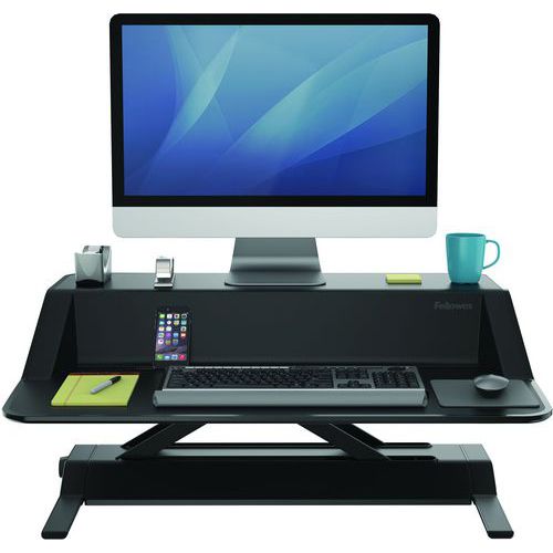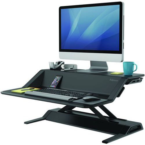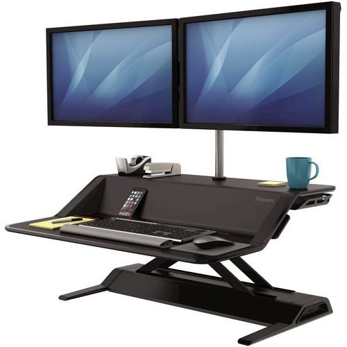 Plateforme assis-debout avec deux surfaces de travail avec espaces utiles pour tous vos accessoires de bureau 22 réglages de hauteur possibles Excellente stabilité et verrouillage de la plateforme à la hauteur souhaitée Passe-câbles intégré pour un encombrement minimal Entièrement assemblée pour une installation rapide et facile.