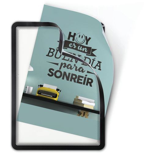 Pochette cadre adhésive avec impression double face, design en pointillés. Fermeture par 3 bandes adhésives : tenue parfaite du document. Affichage double face sur vitre grâce au cadre recto verso. Utilisation double orientation : portrait ou paysage. Pochette spécifique aux grands formats.