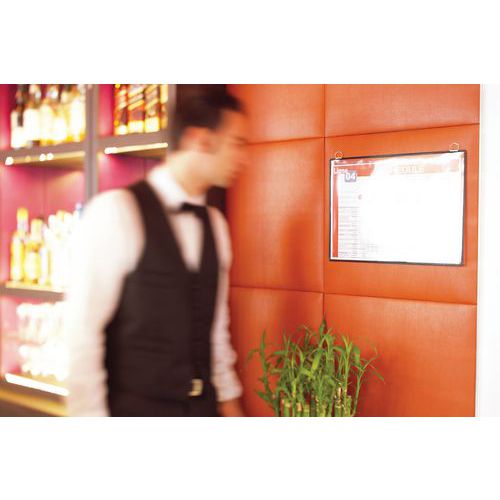 Pochette d'affichage à accrocher pour documents A3, orientation portrait. Cadre fil d'acier incassable TARIFOLD. Coloris attrayants permettant un affichage thématique. Surface transparente antireflets. Anse métallique chromée très résistante. pour fixation au mur. Solution pratique pour afficher et encadrer tout type de documents A3. Idéale pour l’affichage en entreprise, sur les points d’information, dans les lieux publics, les couloirs, les halls d’accueil. Pour l'affichage de documents permanents (horaires, réglements, sécurité, évacuation, instruction hygiène...)