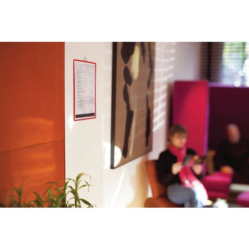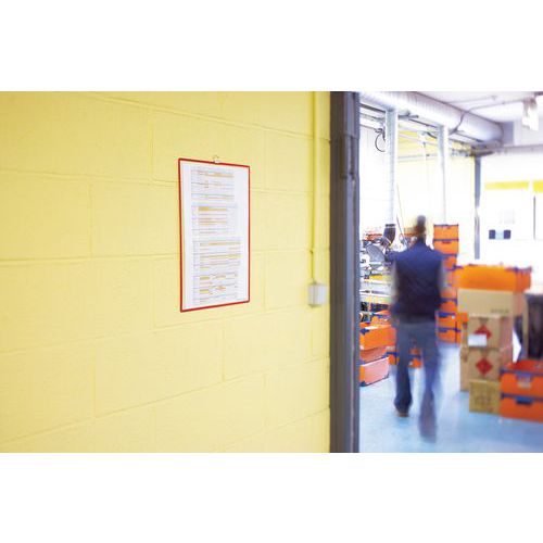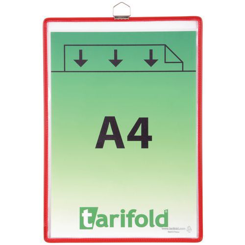 Pochette d'affichage à accrocher pour documents A3, orientation portrait. Cadre fil d'acier incassable TARIFOLD. Coloris attrayants permettant un affichage thématique. Surface transparente antireflets. Anse métallique chromée très résistante. pour fixation au mur. Solution pratique pour afficher et encadrer tout type de documents A3. Idéale pour l’affichage en entreprise, sur les points d’information, dans les lieux publics, les couloirs, les halls d’accueil. Pour l'affichage de documents permanents (horaires, réglements, sécurité, évacuation, instruction hygiène...)