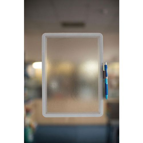 Pochette cadre adhésive offrant la possibilité d'écrire directement sur le document A4 à insérer. Impression double face, design en pointillés. Fermeture par 3 bandes adhésives : tenue parfaite du document. Affichage double face sur vitre grâce au cadre recto verso. Pochette porte-copie avec porte-stylo latéral intégré (stylo non fourni).