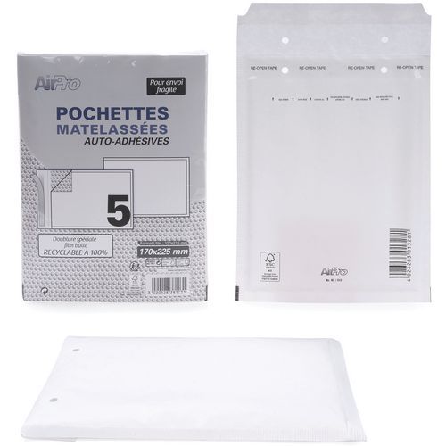 | Intitulé du produit | Pochettes 150x215 125g kraft blanc auto adhésives matelassées, Avec fenêtre: non, Grammage: 125 g/m² |