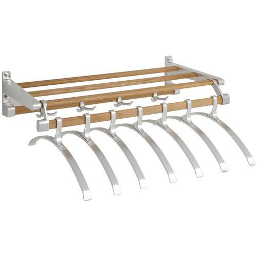 Portant mural aluminium anodisé de belle finition avec patères. Matériaux de structure, barre et patères résistants, durables. Plateau de rangement niveau supérieur constitué de lattes. 1 tringle arrière avec patères, 1 tringle avant porte-cintres.