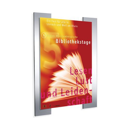 Ce porte-affiche est doté d’un cadre design, constitué de deux panneaux en aluminium. Le compartiment qui accueille les affiches peut être facilement ouvert et permet dès lors un changement rapide et aisé du contenu.