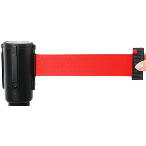 Poteau à sangle étirable avec 3 points d'accrochage. Sangle rétractable avec système d'autofreinage : ne se rétracte pas brusquement en cas de décrochage. Socle équipé de patins en caoutchouc pour plus de stabilité.