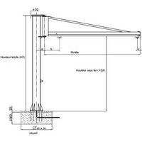 Construction mécano-soudée très robuste. Facile à mettre en œuvre. Profilé creux. Finition polyuréthane (jaune RAL 1028). Vitesse de levage maximum = 16 m/min. Hauteur sous fer de 2,5 m en standard. Autres dimensions : nous consulter. Disponible avec une portée de 2, 3, 4, 5, 6 ou 7 m. Autres portées : nous consulter. Poids : selon modèle, nous consulter. Options possibles : interrupteur mural cadenassable, palan électrique ou manuel… Fixation sur massif béton par crosses d’ancrage (gabarit et crosses en option) ou fixation sur dalle béton par cheville chimique (en option) avec ou sans semelle de répartition (en option). Mise en place de la potence : prévoir 150 mm de garde sous le plafond. Mise en place et installation : nous consulter.