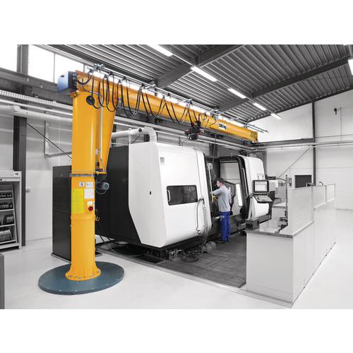 Potence sur fût à flèche surélevée, rotation totale 360°. Rotation aisée, assurée par un roulement souple (situé en tête de colonne) et des galets (situés sur la partie inférieure du bras). Hauteur sous fer standard : 3 m.