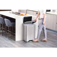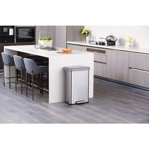 Poubelle à pédale en Inox brossé avec finition antitrace de doigts, équipée d'un liner et d'un couvercle à fermeture silencieuse en matière synthétique et d'une poignée large et robuste à l'arrière.
