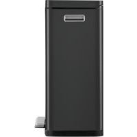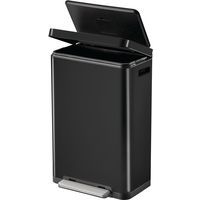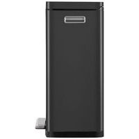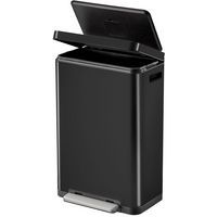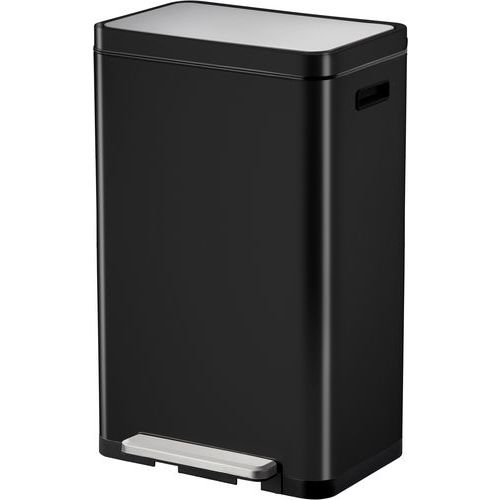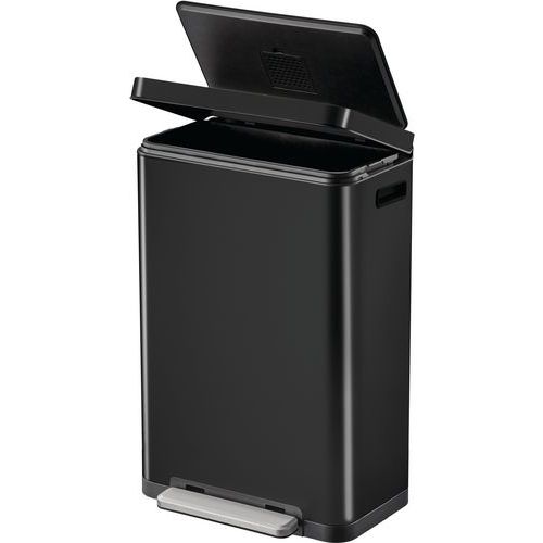 Poubelle élégante rectangulaire équipée d'une pédale extra-large, d'un liner en matière synthétique, d'un couvercle à fermeture silencieuse et de la fonction 'stay-open'.