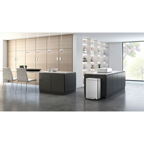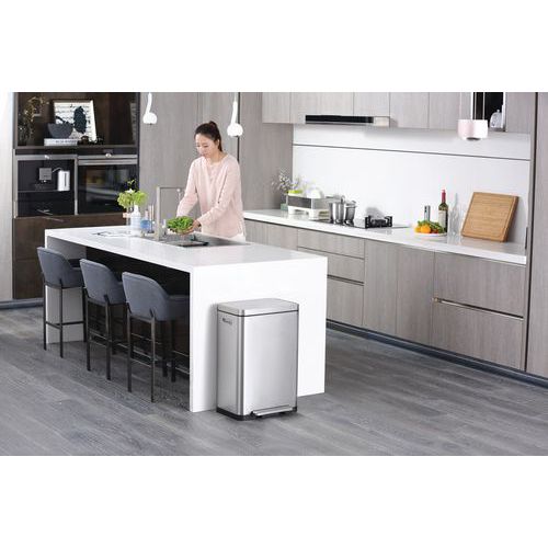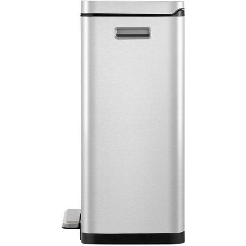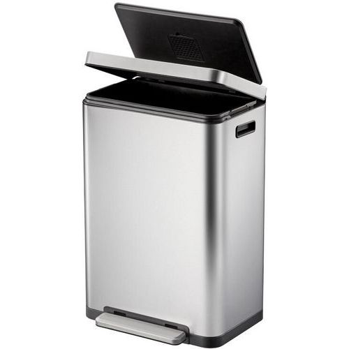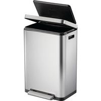 Poubelle élégante rectangulaire équipée d'une pédale extra-large, d'un liner en matière synthétique, d'un couvercle à fermeture silencieuse et de la fonction 'stay-open'.