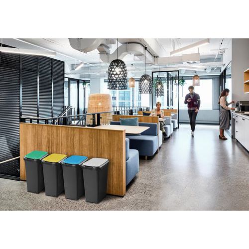 Poubelle de tri sélectif des déchets (papier, plastique, verre, biodéchets). Forme rectangulaire pour un empâtement minimal. . Couvercle avec deux systèmes d’ouverture : par pression ou à bascule. . Système d’accroche fourni. Permet de composer un îlot.. Accepte les sacs poubelle de 50L. Disponible en divers coloris.