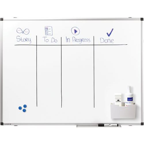 Surface en acier laqué. Surface pour écrire avec marqueur. Cadre en aluminium avec coins en plastique gris foncé. Porte-marqueurs de 30cm. Fixation murale aisée avec fente dissimulée. Possibilité de montage horizontal ou vertical. Fourni avec matériel de montage, auget et marqueur.