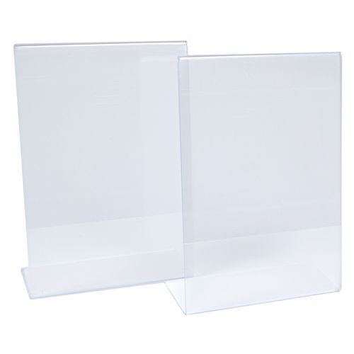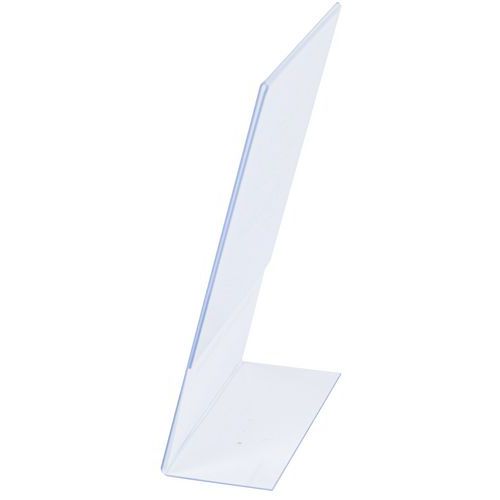 Présentoir de table transparent forme L incliné, se place aisément sur une surface plate.