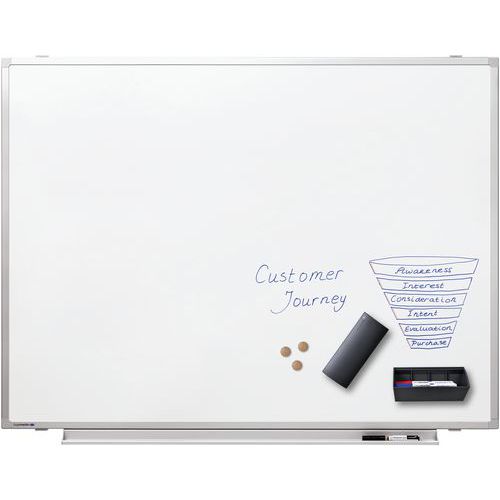 Surface pour écrire avec marqueur. Surface magnétique. Cadre en aluminium avec coins en plastique gris clair. Longueur de l'auget = hauteur du tableau. Fourni avec matériel de montage, auget et marqueur.