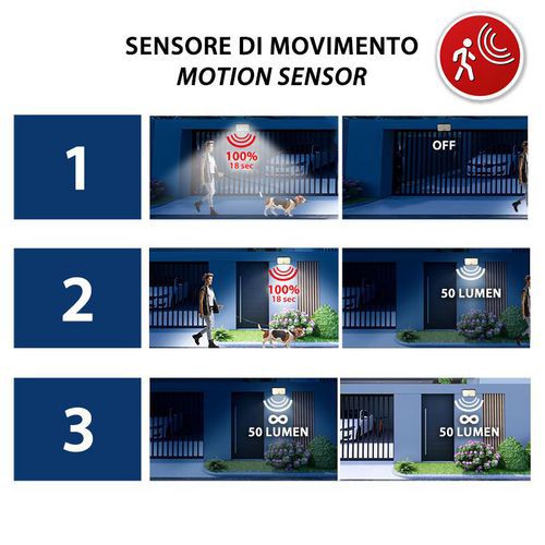 Facile à utiliser : Le spot se charge le jour et s'allume automatiquement la nuit. 3 modes de fonctionnement : avec détecteur de mouvement, détecteur de mouvement avec lumière de courtoisie ou toujours allumé. Lumière extérieure polyvalente :