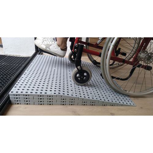 Rampes de seuil modulables pour facliter l'accès aux PMR. Supporte jusqu'à 2000kg. Antidérapante. Fabrication française. Cette rampe permet de franchir de 18 à 199 mm de hauteur. Constituée de polyéthylène, ces rampes de seuil sont entièrement modulables et s'adaptent à toutes les marches