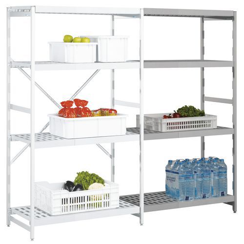 Rayonnage haute résistance températures extrêmes. En aluminium anodisé et tablettes ajourées en polystyrol. Entretien parfait avec clayettes lavables au lave-vaisselle. Pieds réglables pour lissage des inégalités au niveau du sol. Rayonnage d'assemblage simple pour montage facile et rapide. Idéal dans les secteurs alimentaire et horeca avec la restauration, cantines collectives