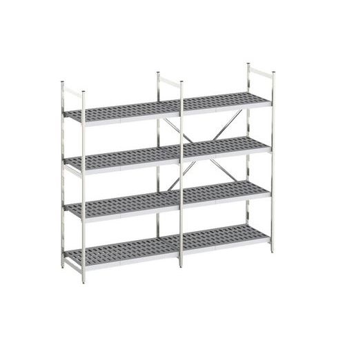 Rayonnage haute résistance températures extrêmes. En aluminium anodisé et tablettes ajourées en polystyrol. Entretien parfait avec clayettes lavables au lave-vaisselle. Pieds réglables pour lissage des inégalités au niveau du sol. Rayonnage d'assemblage simple pour montage facile et rapide. Idéal dans les secteurs alimentaire et horeca avec la restauration, cantines collectives