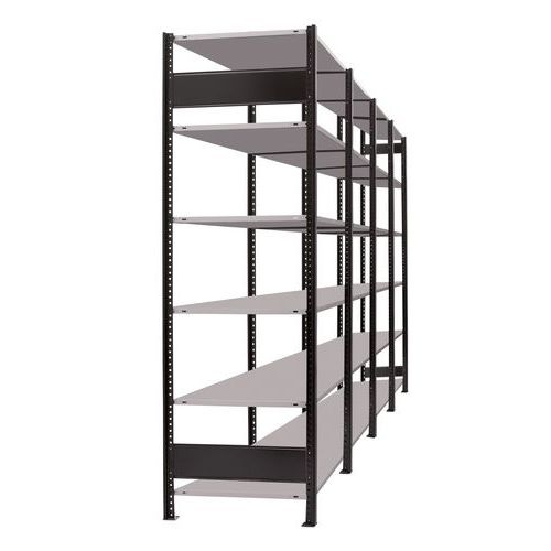 Rayonnage bureau de belle finition pour charge légère. Tablette pleine tôlée pour toutes natures d'objets. Butée centrale pour délimitation de chaque face. Montant plein tôlé sans perforation face avant. Pied de protection pour préserver les sols. Montage sans outils, par système de clip.