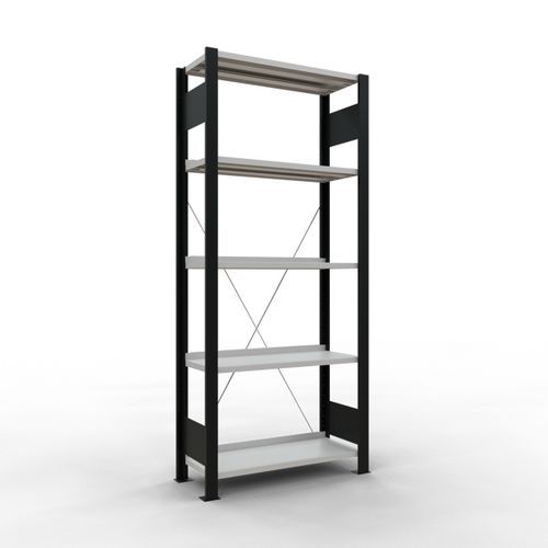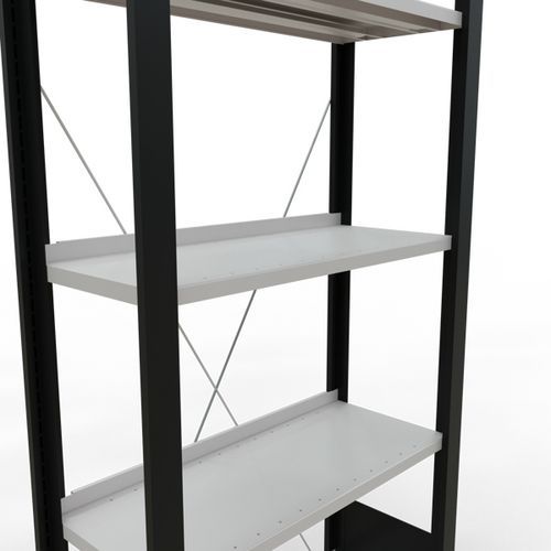 Rayonnage bureau de belle finition pour charge légère. Tablette pleine tôlée pour toutes natures d'objets. Montant plein tôlé sans perforation face avant. Barre de butée pour éviter la chute des objets. Pied de protection pour préserver les sols. Montage sans outils, par système de clip.