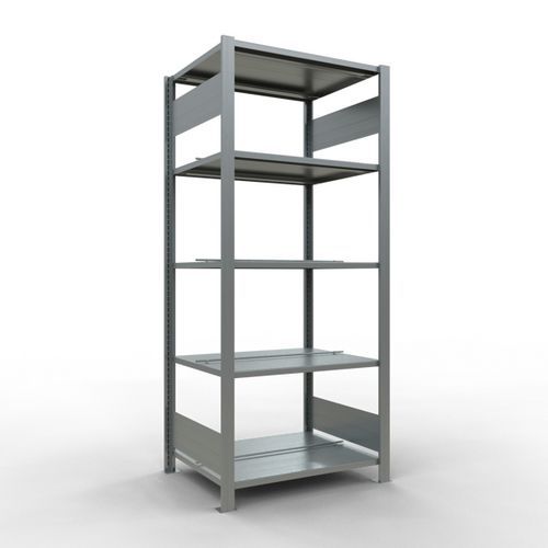 Rayonnage bureau de belle finition pour charge légère. Tablette pleine tôlée pour toutes natures d'objets. Butée centrale pour délimitation de chaque face. Montant plein tôlé sans perforation face avant. Pied de protection pour préserver les sols. Montage sans outils, par système de clip.